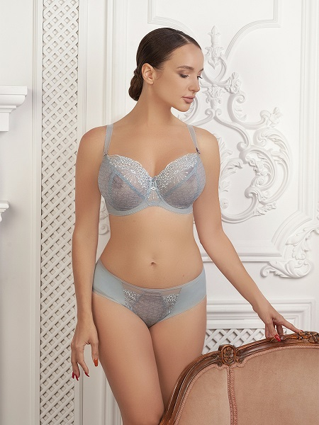 Бюст Софт - мягкая чашка на каркасах. Полупрозрачные чашки изготовлены из полотна с вышивкой. Для поддержания формы груди внутренняя поверхность чашки дублирована неэластичной сеткой. Застежка на 2-3 крючка и ширина бретели градируется в зависимости от размера. Коллекция выполнена из сетки нежно голубого цвета, декорированы вышивкой. Коллекция дополнена двумя видами трусиков -слипы и бразилиано, передняя планка украшена вышивкой гармонирующей с верхом изделия. Спинка в трусиках и бразилиано мягкая микрофибра.